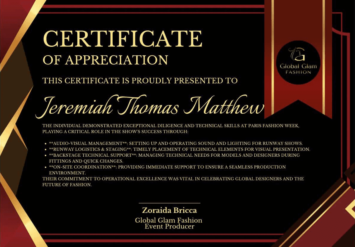 Coordinated music cues for all runway walks Managed green room operations and team logistics Ensured smooth execution of the event from start to finish Supported engineering and technical team for live event readiness